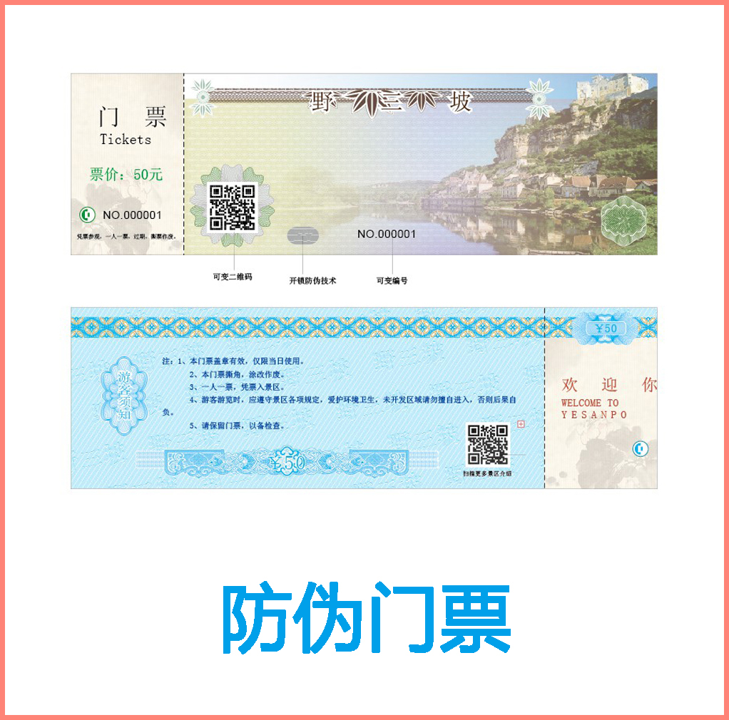 門票行業(yè)越來越猖獗,像一些價格比較高的門票,比方,大型文藝演唱會、體育比賽、、覽會以及旅游景點門票,都呈現(xiàn)過偽鈔疑問,不法分子會經(jīng)過制作偽鈔來獲取暴利。因而,為了保護主辦者和消費者的合法利益,保護精力和文化領域內(nèi)的市場秩序,門票的防偽有必要選用難于仿制的高科技防偽技術。